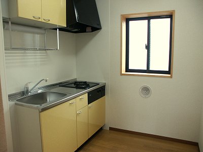 システムキッチンは南仏プロヴァンスをイメージした明るい色使いです。ドアは北欧スウェーデンのデザインのような採光窓と肌色に近い木目パネルを採用しました。 |