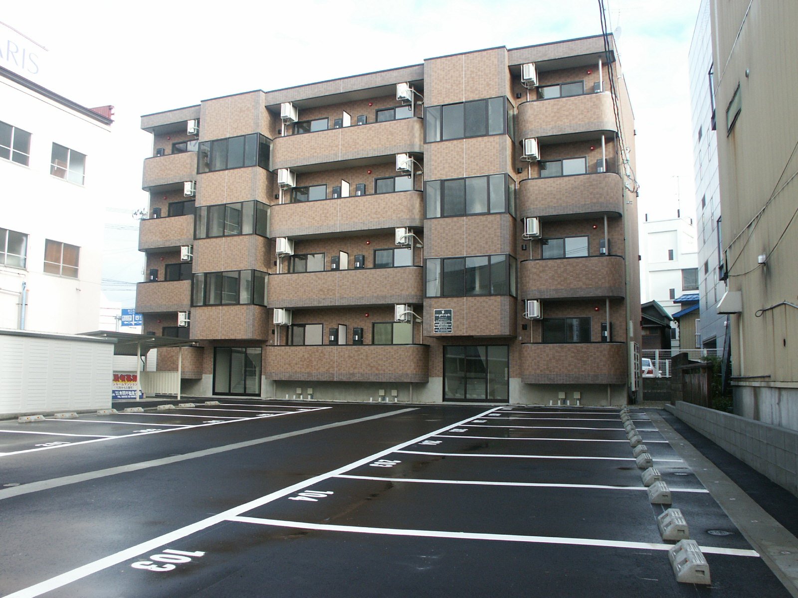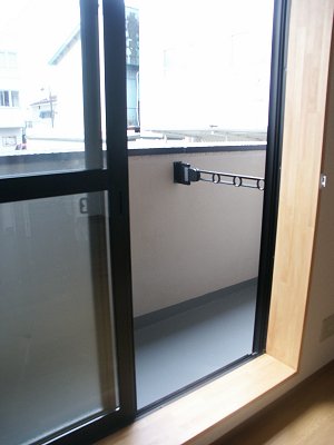 バルコニーには可倒式物干し竿受け。上部階段の踊場からは近くの県立病院などとともに、出羽富士こと鳥海山が見えます。 |